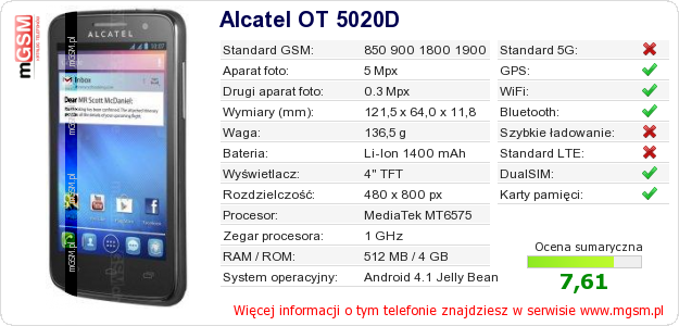 Dane telefonu Alcatel OT 5020D na Twojej stronie