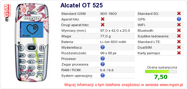 Dane telefonu Alcatel OT 525 na Twojej stronie