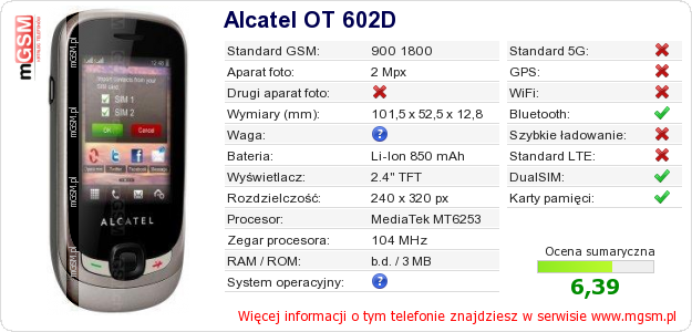 Dane telefonu Alcatel OT 602D na Twojej stronie