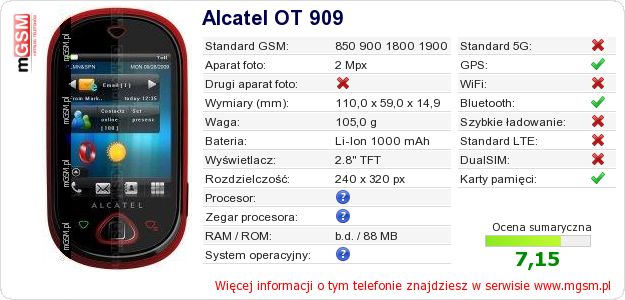 Dane telefonu Alcatel OT 909 na Twojej stronie