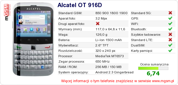 Dane telefonu Alcatel OT 916D na Twojej stronie