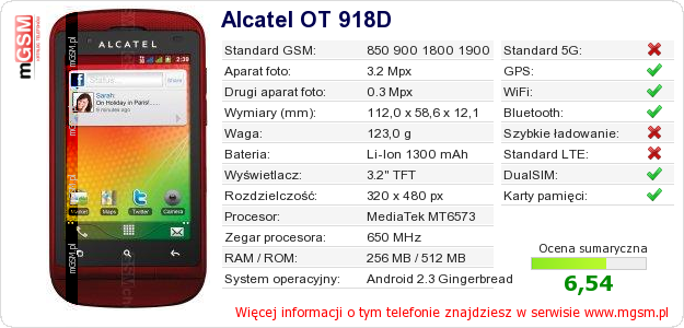 Dane telefonu Alcatel OT 918D na Twojej stronie