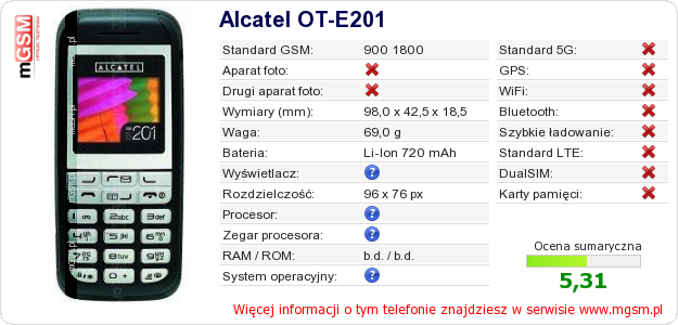 Dane telefonu Alcatel OT-E201 na Twojej stronie