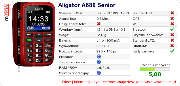 Dane telefonu Aligator A680 Senior na Twojej stronie