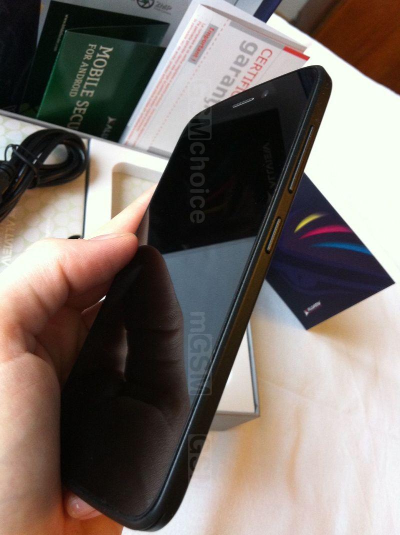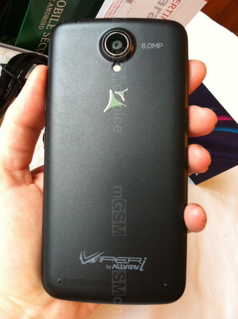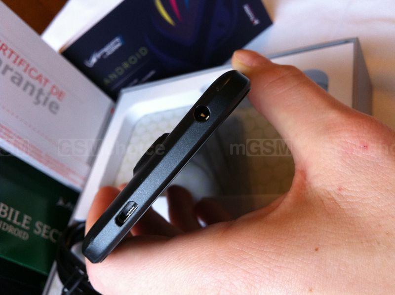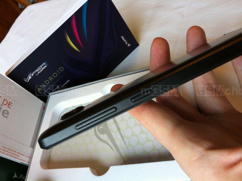Przód błyszczy czernią wyświetlacza. Dopiero po zaświeceniu ekranu ukazują się trzy dotykowe przyciski na dolnym panelu. Mają one trochę inny wygląd niż w innych smartfonach, są małe i rysowane na planie koła. Nasuwa mi się w pamięci logo zespołu Coma. U góry widać jedynie kratkę głośnika i obiektyw przedniej kamerki. Po bardziej uważnym przyjrzeniu odnajdziemy także czujnik światła. W mocnym świetle żarówek LED, lub słonecznym, przy wyłączonym ekranie można także dostrzec siatkę digitizera, ale nie wpływa to na komfort użytkowania telefonu.Viper V1i ma jedynie dwa przyciski fizyczne umiejscowione wygodnie pod prawym kciukiem: do regulacji głośności i zasilania. Złącza mini-jack i microUSB zostały wkomponowane u góry obudowy.