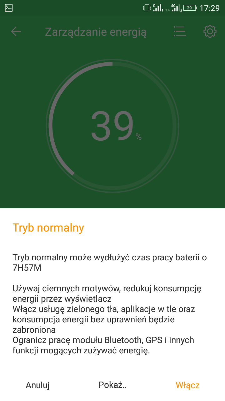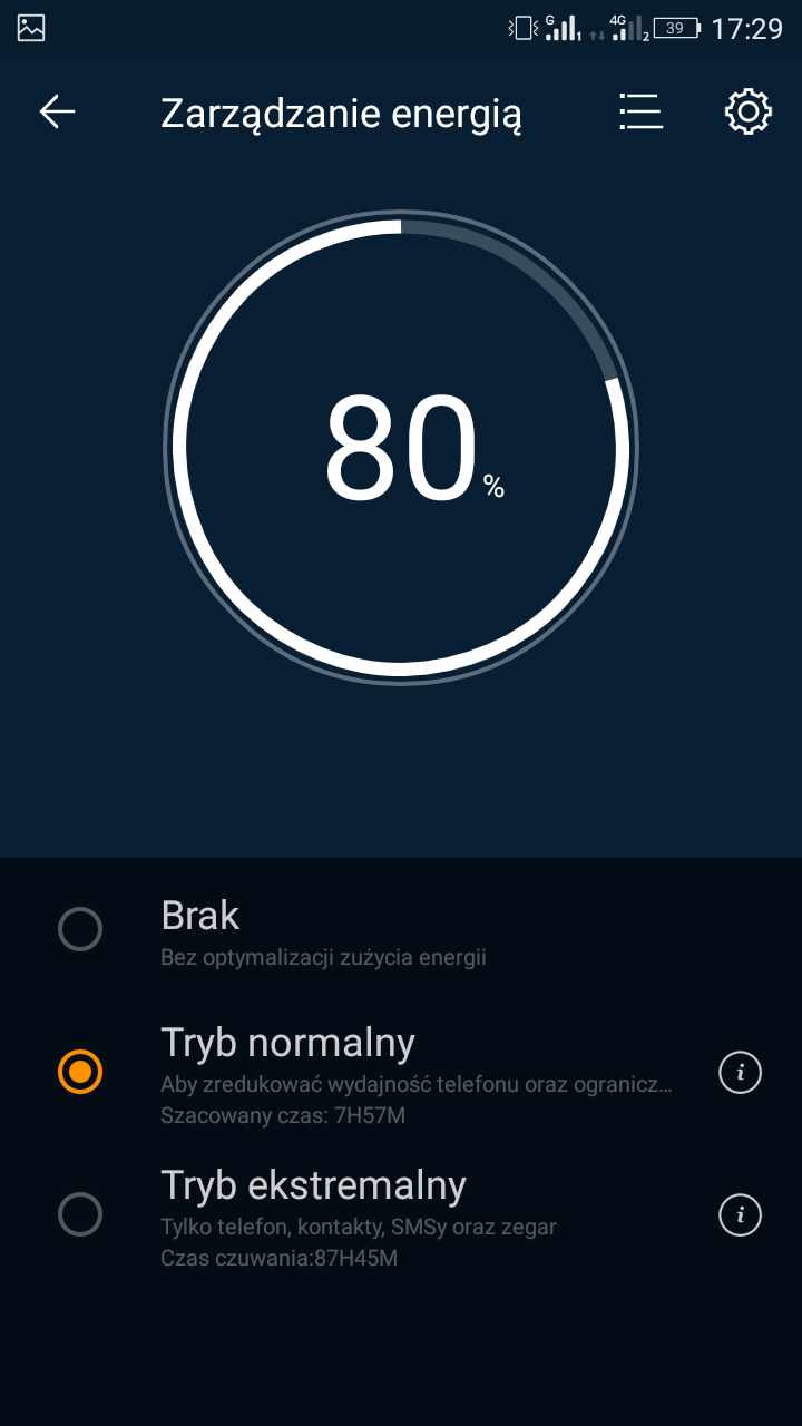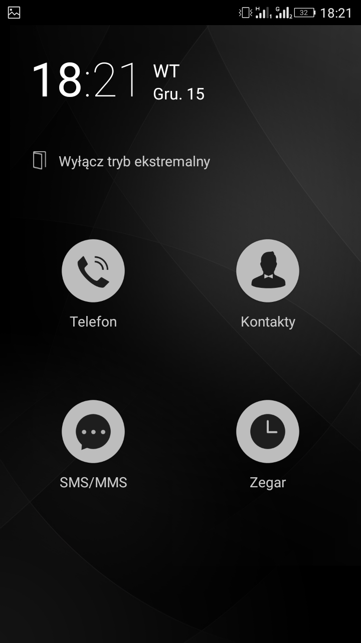 Klikając na jedną z ikonek tegoż managera można uruchomić tryb "ekstremalnego oszczędzania energii". Brzmi tajemniczo i groźnie, prawa? Ale działa całkiem sprawnie, zapewniając bardzo bardzo długie działanie baterii. Niestety, jak to w życiu bywa, jest coś za coś - uruchomienie rzeczonego trybu ogranicza nam funkcjonalność smartfonu - będą działały jedynie funkcje telefoniczne, kontakty, SMS-y i... zegar (budzik).