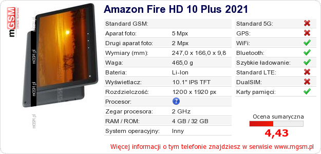 Dane telefonu Amazon Fire HD 10 Plus 2021 na Twojej stronie
