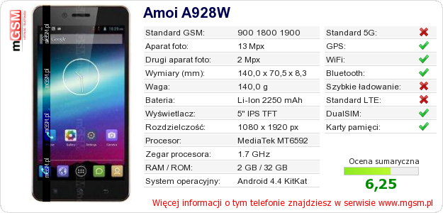 Dane telefonu Amoi A928W na Twojej stronie