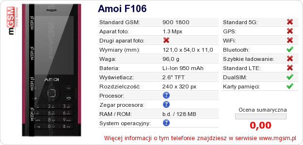 Dane telefonu Amoi F106 na Twojej stronie