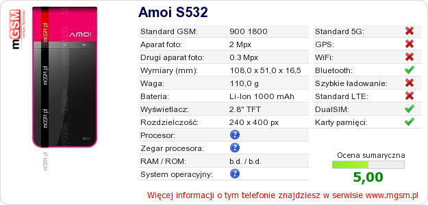 Dane telefonu Amoi S532 na Twojej stronie