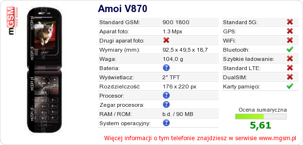Dane telefonu Amoi V870 na Twojej stronie