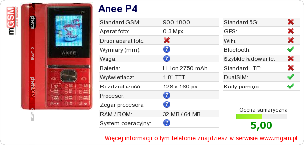 Masz swoją stronę? Chcesz wstawić gdzieś informacje o podstawowych danych telefonu Anee P4 ? To bardzo proste. Możesz pobrać obrazek, lub skopiować i wkleić na stronę poniższy kod:Wklejenie tego kodu spowoduje wyświetlenie poniższego obrazka: