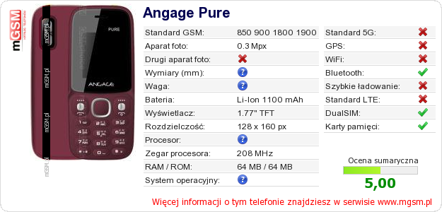 Masz swoją stronę? Chcesz wstawić gdzieś informacje o podstawowych danych telefonu Angage Pure ? To bardzo proste. Możesz pobrać obrazek, lub skopiować i wkleić na stronę poniższy kod:Wklejenie tego kodu spowoduje wyświetlenie poniższego obrazka: