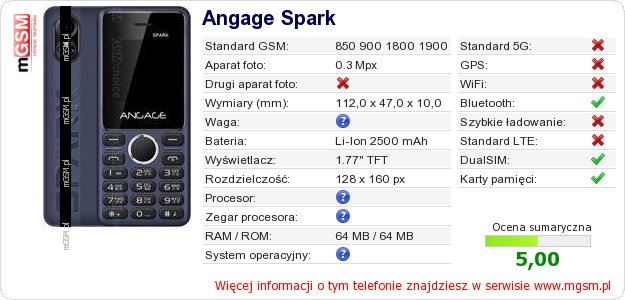 Masz swoją stronę? Chcesz wstawić gdzieś informacje o podstawowych danych telefonu Angage Spark ? To bardzo proste. Możesz pobrać obrazek, lub skopiować i wkleić na stronę poniższy kod:Wklejenie tego kodu spowoduje wyświetlenie poniższego obrazka: