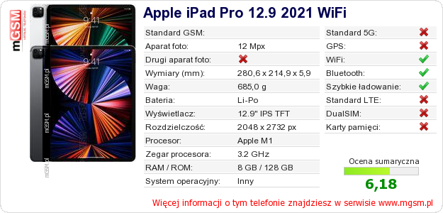 Dane telefonu Apple iPad Pro 12.9 2021 WiFi na Twojej stronie