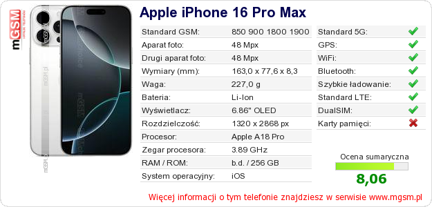 Dane telefonu Apple iPhone 16 Pro Max na Twojej stronie