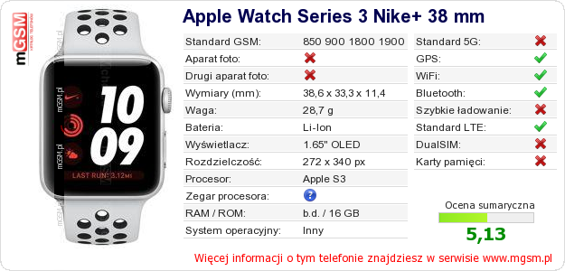 Dane telefonu Apple Watch Series 3 Nike+ 38 mm na Twojej stronie