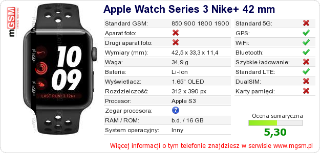 Dane telefonu Apple Watch Series 3 Nike+ 42 mm na Twojej stronie