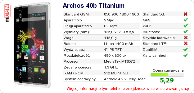 Dane telefonu Archos 40b Titanium na Twojej stronie