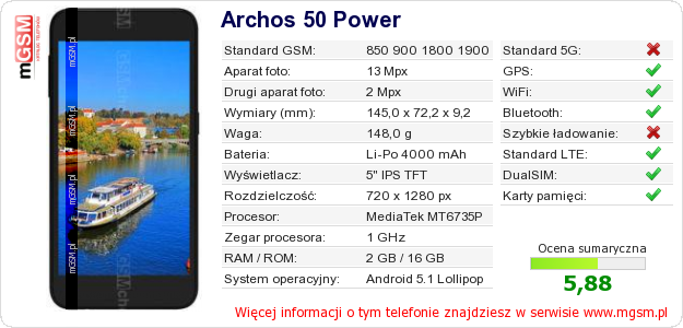 Dane telefonu Archos 50 Power na Twojej stronie