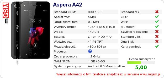 Dane telefonu Aspera A42 na Twojej stronie