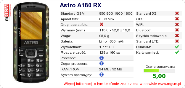 Dane telefonu Astro A180 RX na Twojej stronie