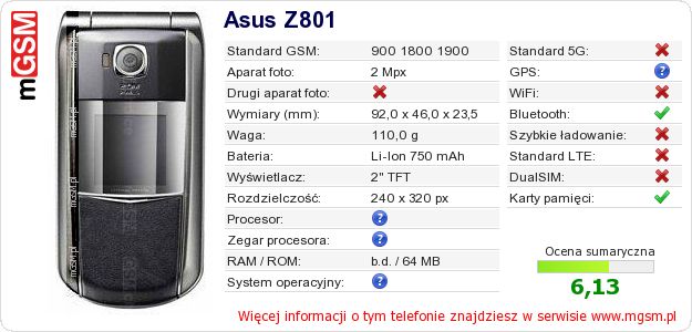 Dane telefonu Asus Z801 na Twojej stronie