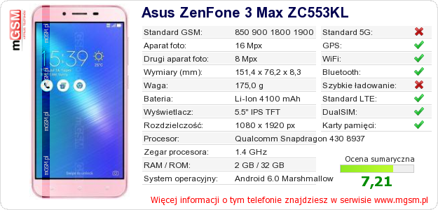 Dane telefonu Asus ZenFone 3 Max ZC553KL na Twojej stronie