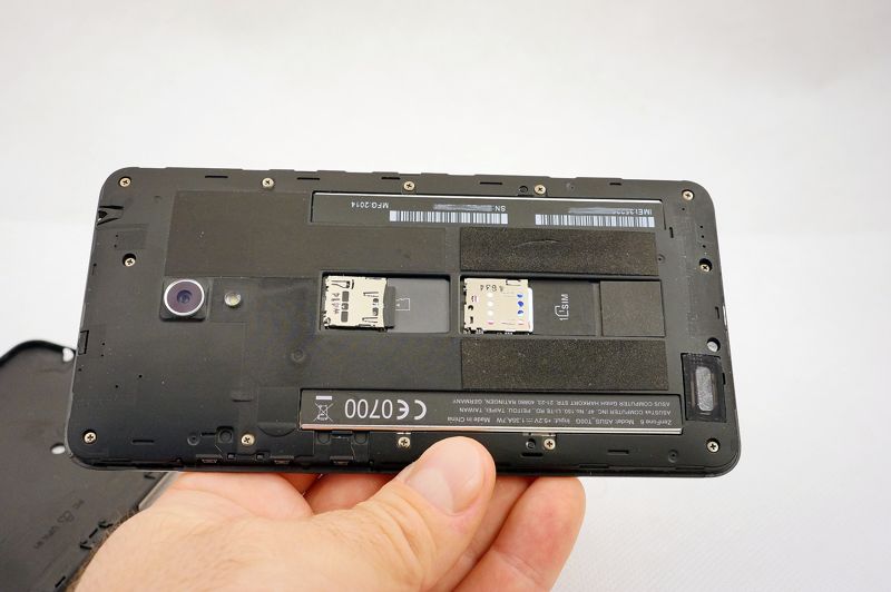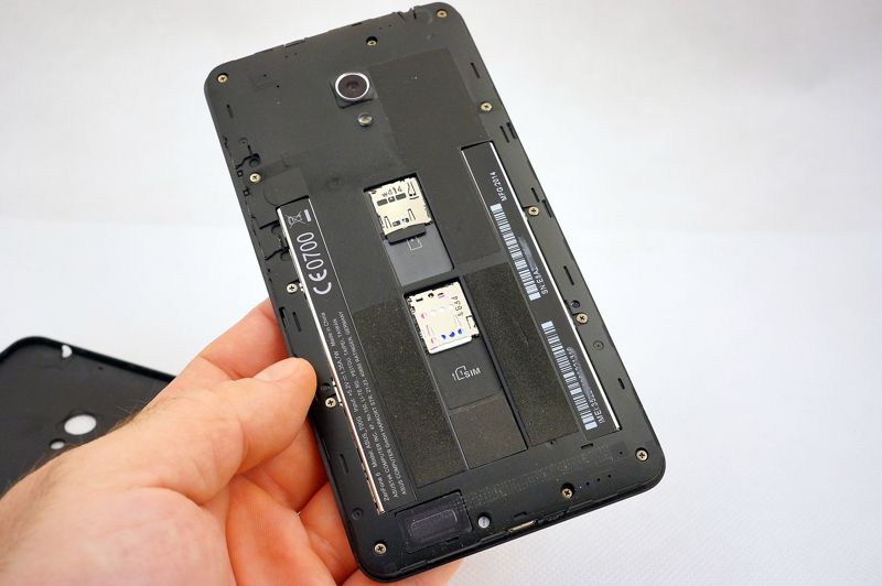 A skoro już mowa o gniazdach na karty, nasz fablet ma dwa. Drugie przeznaczono dla nośnika pamięci microSD o pojemności do 64 GB. Gniazda umieszczono dość nietypowo. Po zdjęciu tylnej pokrywy, nakładanej na zasadzie kapsla, widzimy gładką taflę tworzywa z zagłębieniem pośrodku. W owym zagłębieniu są właśnie gniazda na karty. A bateria... gdzieś pod nimi. Choć smartfon ma rozbieralną obudowę - baterii nie wyjmiemy bez użycia narzędzi i wiedzy, jak rozebrać obudowę.