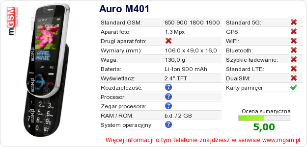 Dane telefonu Auro M401 na Twojej stronie