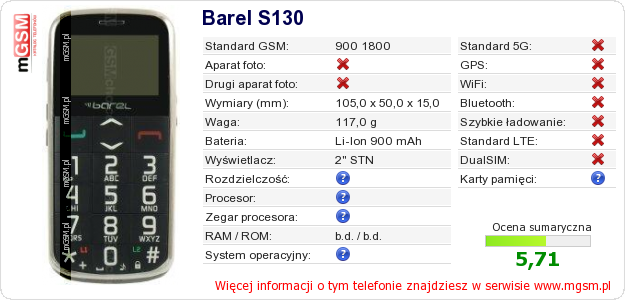 Dane telefonu Barel S130 na Twojej stronie