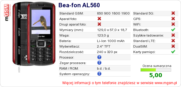 Masz swoją stronę? Chcesz wstawić gdzieś informacje o podstawowych danych telefonu Bea-fon AL560 ? To bardzo proste. Możesz pobrać obrazek, lub skopiować i wkleić na stronę poniższy kod:Wklejenie tego kodu spowoduje wyświetlenie poniższego obrazka:
