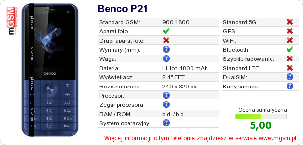 Dane telefonu Benco P21 na Twojej stronie