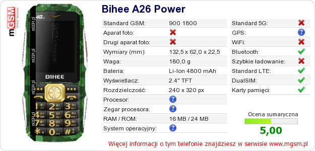 Dane telefonu Bihee A26 Power na Twojej stronie