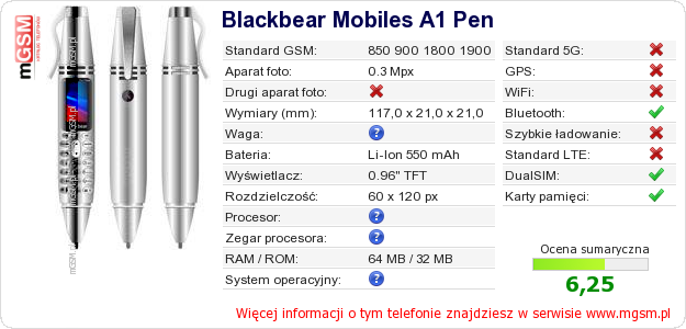 Masz swoją stronę? Chcesz wstawić gdzieś informacje o podstawowych danych telefonu Blackbear Mobiles A1 Pen ? To bardzo proste. Możesz pobrać obrazek, lub skopiować i wkleić na stronę poniższy kod:Wklejenie tego kodu spowoduje wyświetlenie poniższego obrazka: