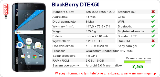 Dane telefonu BlackBerry DTEK50 na Twojej stronie
