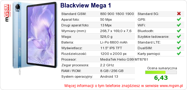 Dane telefonu Blackview Mega 1 na Twojej stronie