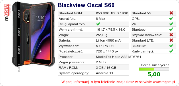 Dane telefonu Blackview Oscal S60 na Twojej stronie