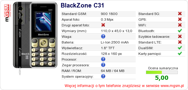Dane telefonu BlackZone C31 na Twojej stronie