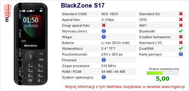 Dane telefonu BlackZone S17 na Twojej stronie
