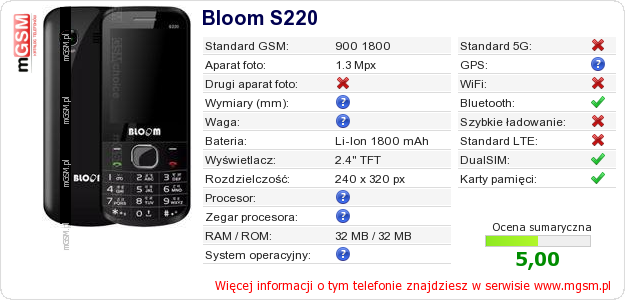 Dane telefonu Bloom S220 na Twojej stronie