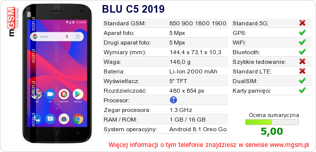 Dane telefonu BLU C5 2019 na Twojej stronie