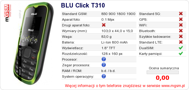 Dane telefonu BLU Click T310 na Twojej stronie