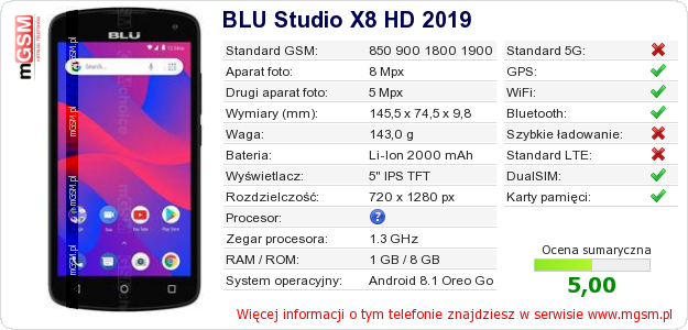 Dane telefonu BLU Studio X8 HD 2019 na Twojej stronie