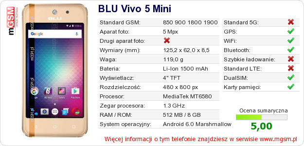Dane telefonu BLU Vivo 5 Mini na Twojej stronie