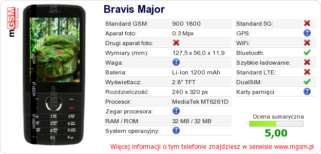 Dane telefonu Bravis Major na Twojej stronie
