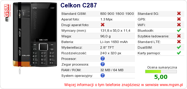 Dane telefonu Celkon C287 na Twojej stronie