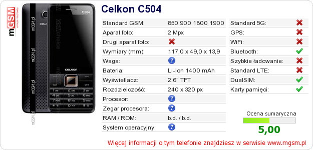 Dane telefonu Celkon C504 na Twojej stronie