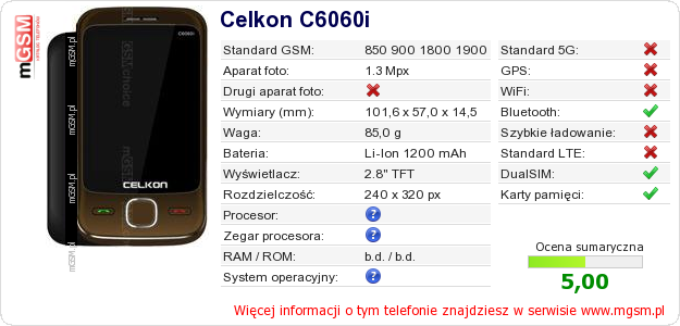 Dane telefonu Celkon C6060i na Twojej stronie