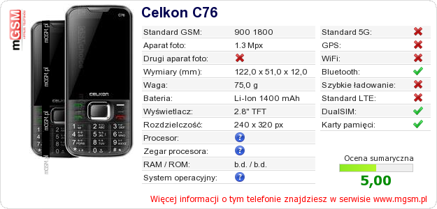 Dane telefonu Celkon C76 na Twojej stronie